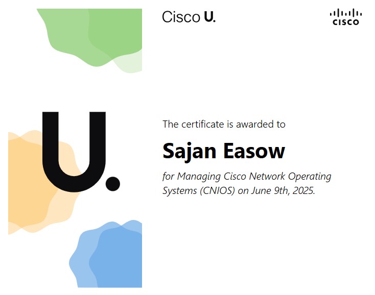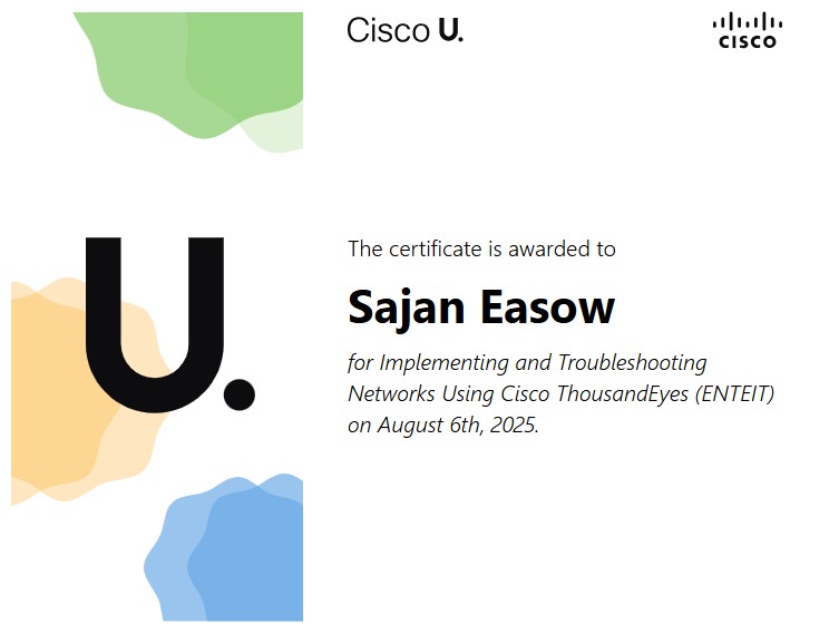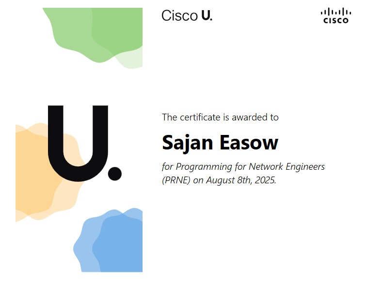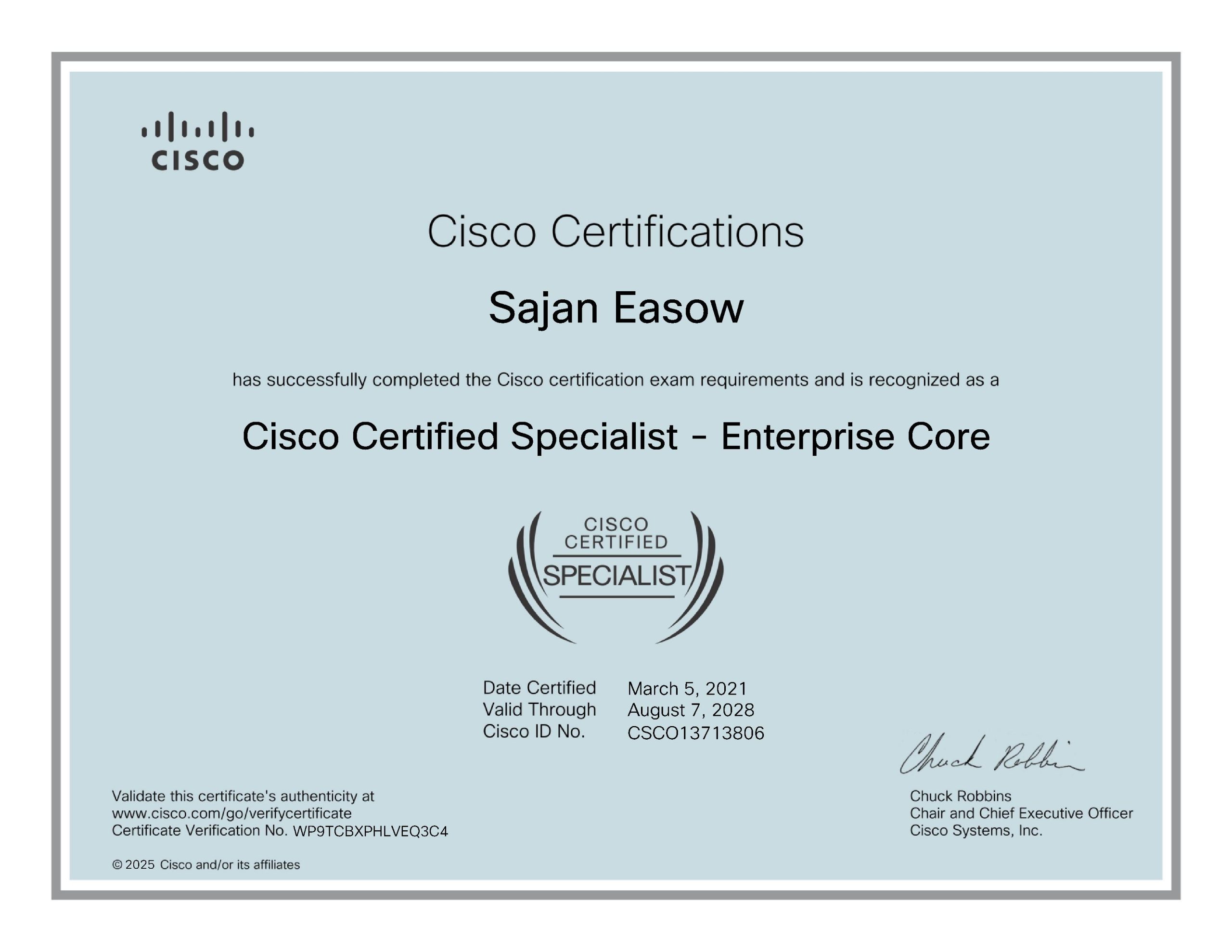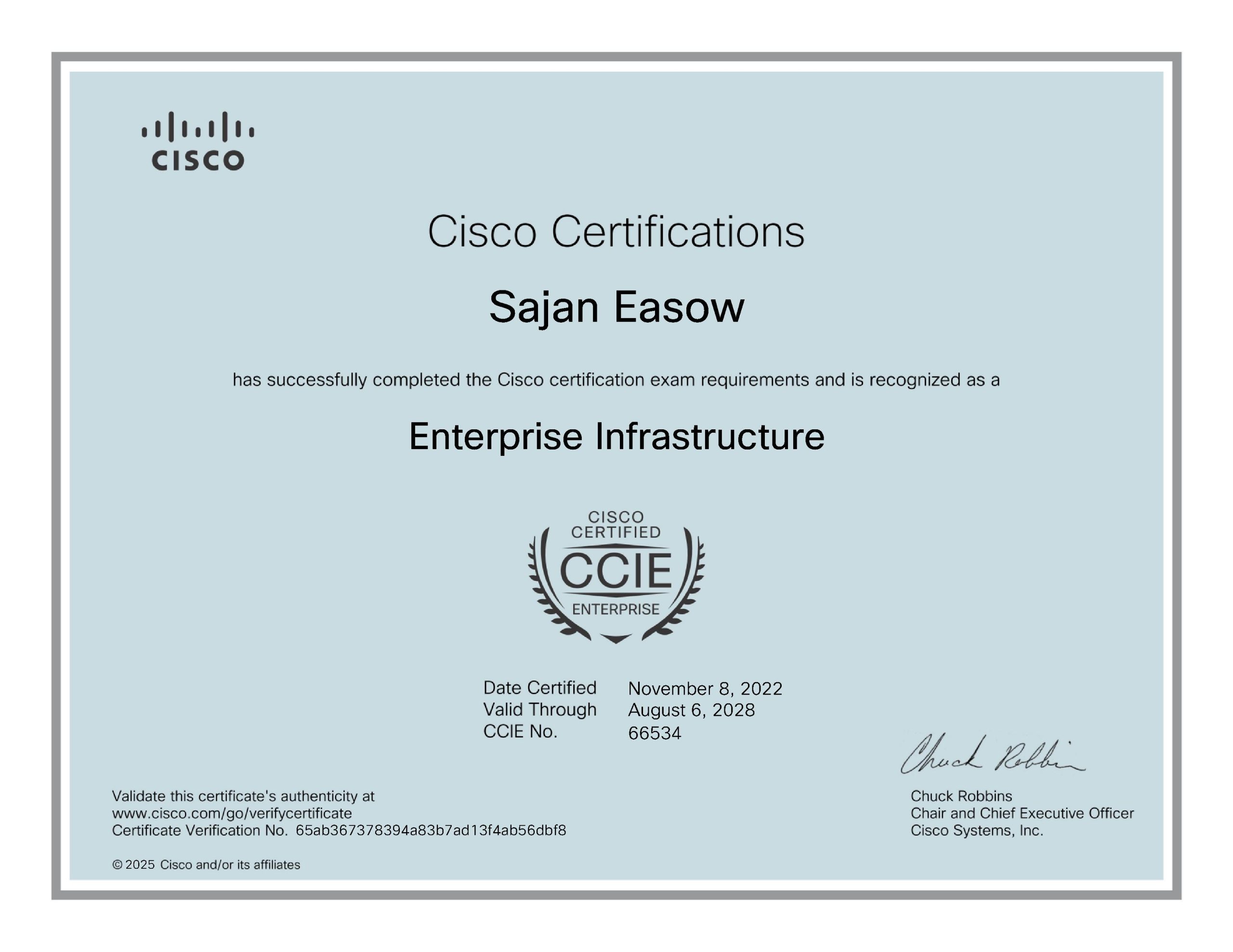 Achievements CCIE Enterprise Infrastructure Palo Alto PCNSE Fortinet Solution Specialist – Network Security Fortinet Network Security Architect Fortinet NSE 7 SD-WAN Fortinet NSE 4 Fortinet NSE 2 Fortinet NSE 1 Cisco Thousand Eyes Cisco PRNE Cisco DCAIAA Cisco CNIOS Cisco DEVNAE Cisco DCAIE Cisco Enterprise Core MCITP MCSA MCTS MCTS – Windows Server & Network Infrastructure MCTS – Active Directory Memberships Very happy to become part of the Cisco Learning Network group and the CCIE Gold Club.